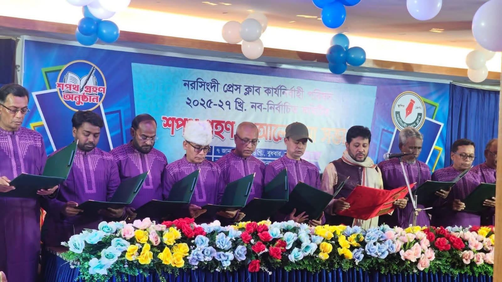 নরসিংদী প্রেসক্লাবের নবনির্বাচিত কার্য নির্বাহী কমিটিকে শপথ পাঠ করাচ্ছেন ডিসি স্যার।