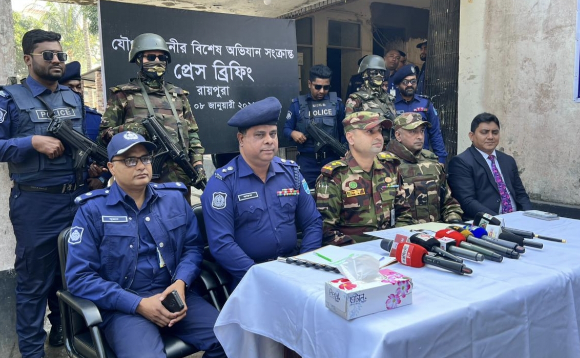 বৃহস্পতিবার (৮ জানুয়ারি) দুপুরে রায়পুরা থানায় আয়োজিত সংবাদ সম্মেলনে এ তথ্য জানান রায়পুরা আর্মি ক্যাম্পের অধিনায়ক লেফটেন্যান্ট কর্নেল মো. আবু বকর সিদ্দিক। এসময় নরসিংদী পুলিশ সুপার মো. আবদুল্লাহ আল-ফারুক, উপজেলা নির্বাহী অফিসার (ইউএনও) মো. মাসুদ রানাসহ সেনাবাহিনী ও পুলিশের ঊধ্বর্তন কর্মকর্তারা উপস্থিত ছিলেন।