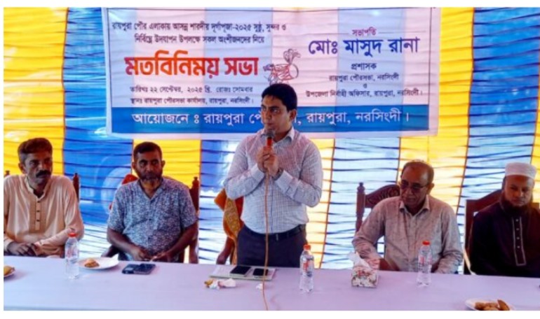 সভায় পৌরসভা সচিব মো. মনিরুজ্জামানের সঞ্চালনায় বক্তব্য রাখেন পৌরসভা বিএনপির সাধারণ সম্পাদক সাইফুল ইসলাম পলাশ, পৌরসভা বিএনপির সাংগঠনিক সম্পাদক আবু বকর সিদ্দিক, রায়পুরা উপজেলা পূজা উদযাপন ফ্রন্টের আহ্বায়ক বাবু দীপক দও, রায়পুরা কেন্দ্রীয় মিলন মন্দিরের সভাপতি বাবু সবুজ নন্দী, সাধারণ সম্পাদক বিজয় পাল, পৌরসভা জামায়াতে ইসলামীর সেক্রেটারি কাজী সফিকুল্লাহ নীরু, পৌরসভা পূজা উদযাপন ফ্রন্টের আহ্বায়ক মিঠু বর্মনসহ স্থানীয় জনপ্রতিনিধি, সাংবাদিক, শিক্ষকসহ গণ্যমান্য ব্যক্তিবর্গ।
