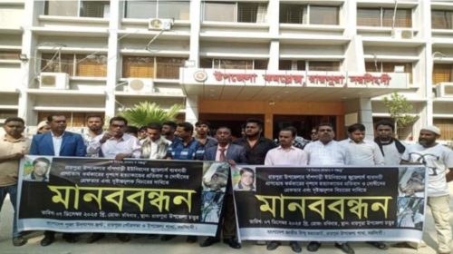 রায়পুরায় জুয়েলার্স ব্যবসায়ী প্রাণতোষ কর্মকার হত্যার প্রতিবাদে দৃষ্টান্তমূলক বিচারের দাবিতে মানববন্ধন